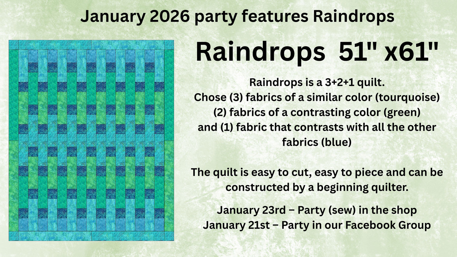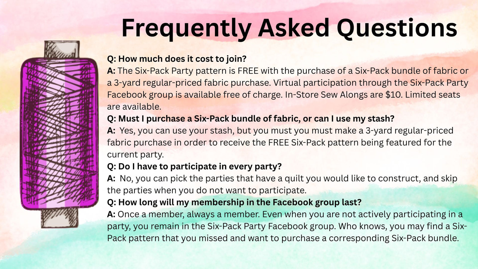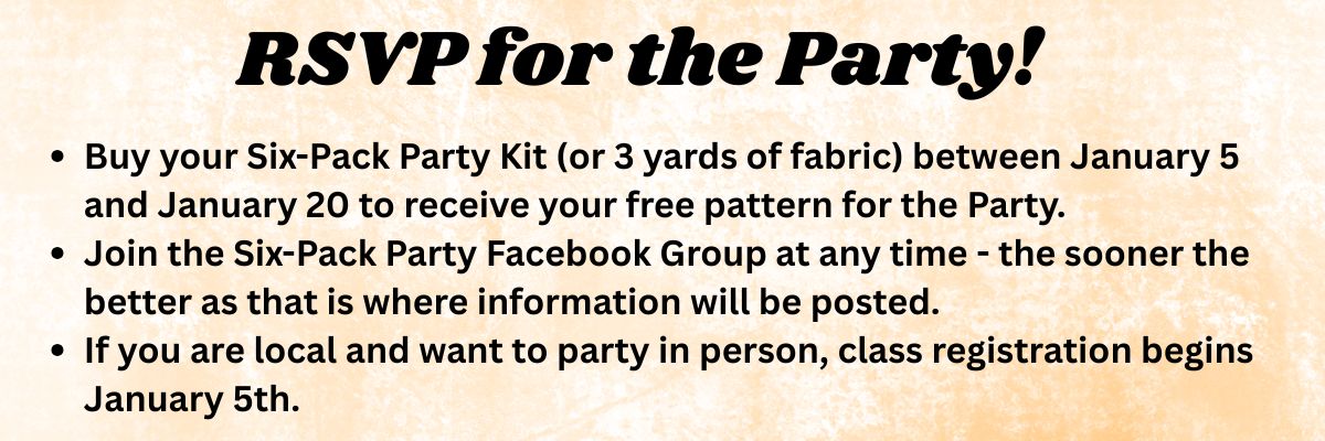 Join us for lively in-shop Six-Pack Party Open Sews or connect from anywhere in our private Facebook group.